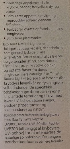 Exo Terra Natural Light er en fuldspektret dagslyslampe, der anbefales som en generel lyskilde til alle typer terrarier. Som et resultat af de levende bølgelængder af lys fra naturligt lys oplever og opfatter krybdyr farver fra omgivelserne overnaturligt. Exo Terra Natural Light hjælper med at forbedre dine krybdyres levevilkår og fysiske velbefindende. De specifikke bølgelængder gør denne lampe velegnet til plantede terrarier og til dyr med lavere UV-krav, såsom slanger, padder (frøer, padder og salamandere) og natdyr. Kombiner med Exo Terra Reptile UVB100, Reptile UVB150 eller ReptileUVB200 (afhængigt af krybdyrets UV-krav) for at intensivere de naturlige sollysforhold.