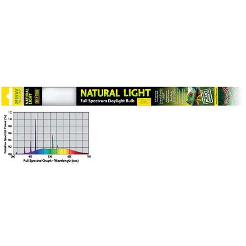 Exo Terra Natural Light er en fuldspektret dagslyslampe, der anbefales som en generel lyskilde til alle typer terrarier. Som et resultat af de levende bølgelængder af lys fra naturligt lys oplever og opfatter krybdyr farver fra omgivelserne overnaturligt. Exo Terra Natural Light hjælper med at forbedre dine krybdyres levevilkår og fysiske velbefindende. De specifikke bølgelængder gør denne lampe velegnet til plantede terrarier og til dyr med lavere UV-krav, såsom slanger, padder (frøer, padder og salamandere) og natdyr. Kombiner med Exo Terra Reptile UVB100, Reptile UVB150 eller ReptileUVB200 (afhængigt af krybdyrets UV-krav) for at intensivere de naturlige sollysforhold.