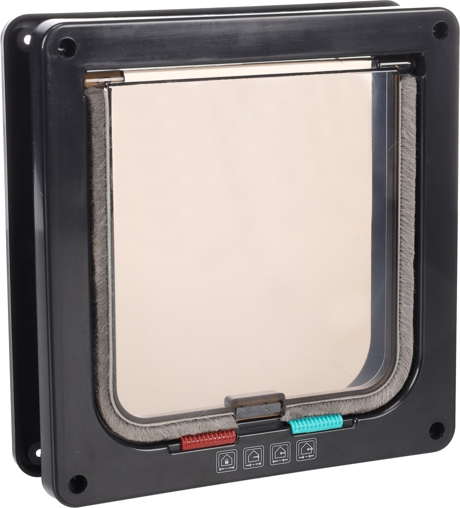 Funktioner døre og klapper:    Kan skæres til , Nem at samle , Lydløs , Skabelon medfølger , Med 4 indstillinger , Med børstetætning , Med skydeknap , Med transparent klap , Med tunnel