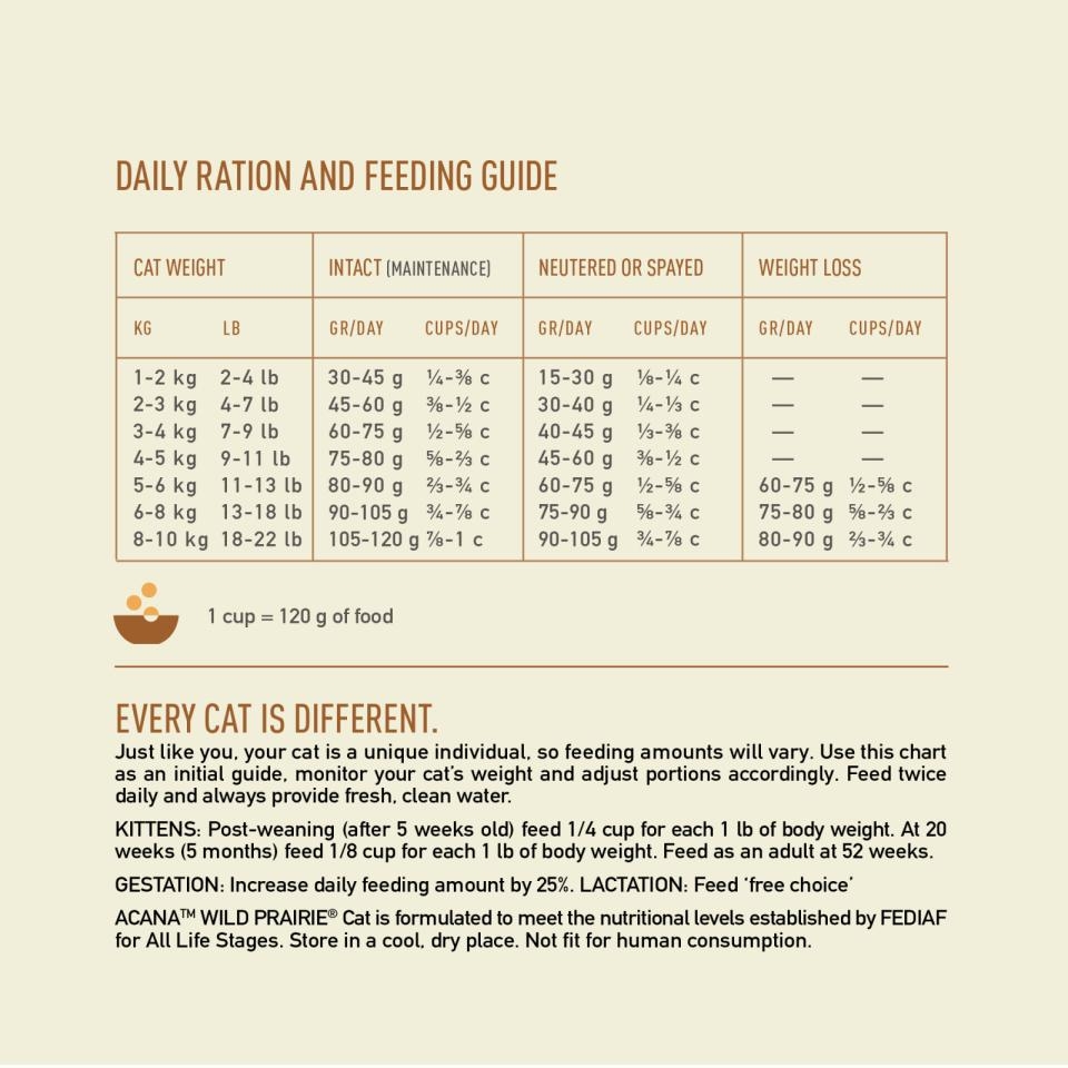 ACANA Wild Prairie Cat er formuleret til at opfylde de ernæringsmæssige niveauer fastsat af FEDIAF for alle livsstadier. Opbevares køligt og tørt.