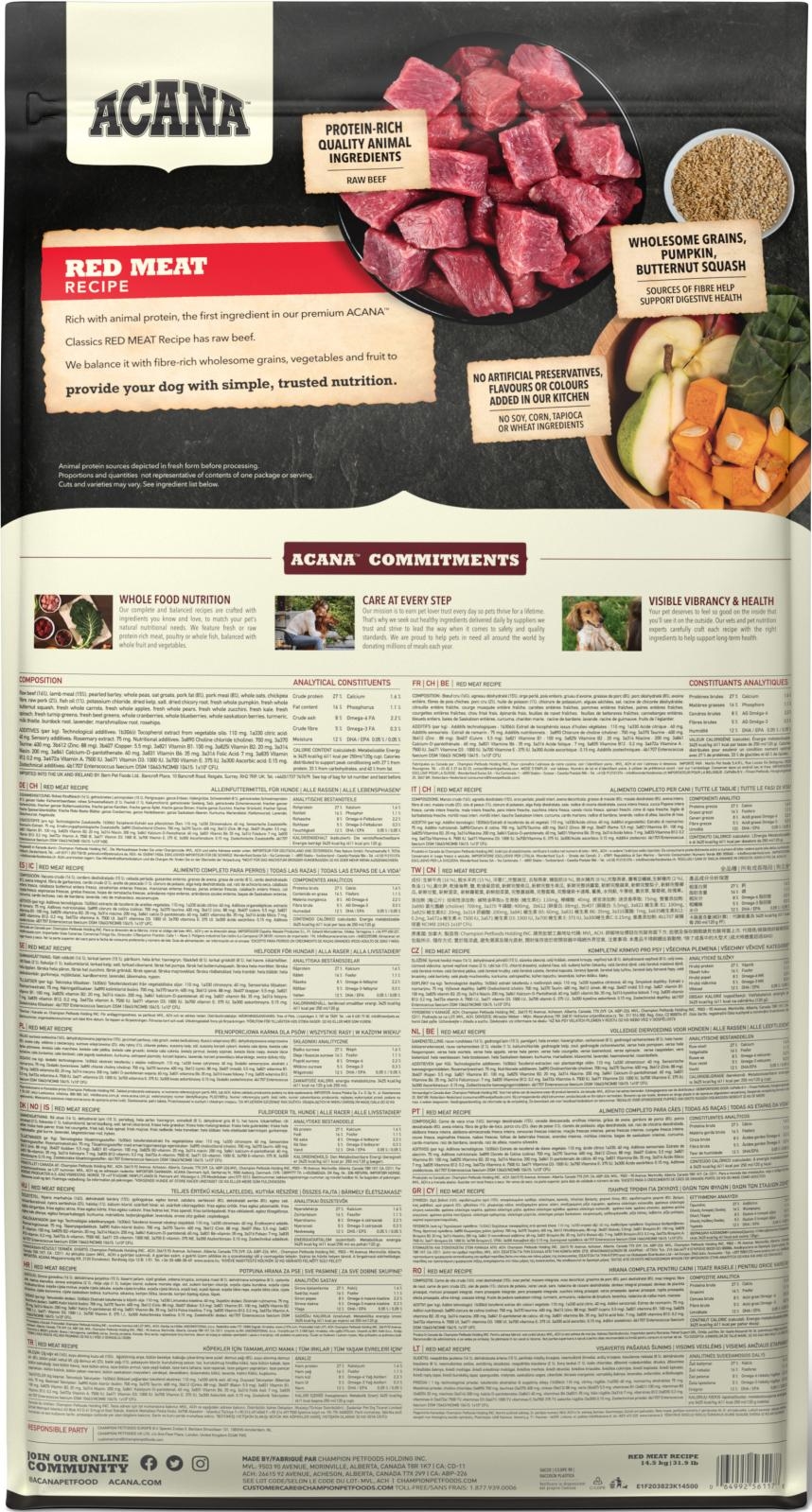 ACANA™ RØDT KØD OPSKRIFT HUNDEMAD er formuleret til at opfylde de ernæringsmæssige niveauer, der er fastsat af FEDIAF's hundemad næringsprofiler for alle livsstadier, bortset fra vækst af store hunde (31,75 kg eller mere som voksen). Opbevares på et køligt, tørt sted. Ikke til menneskelig konsum.