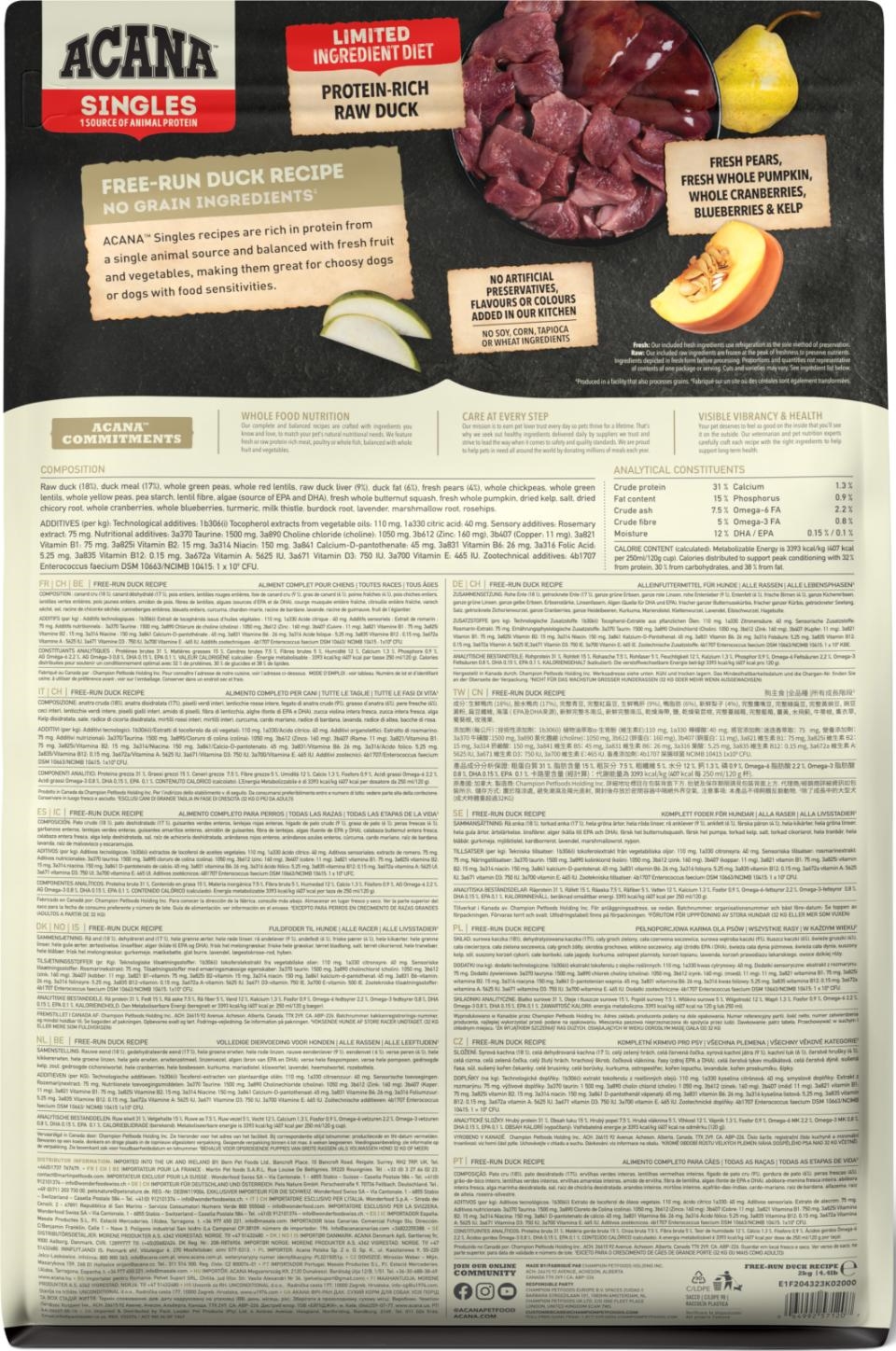 • LAKTATION: fodre 'fri valg'. ACANA™ FREE RUN DUCK er formuleret til at opfylde de ernæringsmæssige niveauer, der er fastsat af FEDIAF for alle livsstadier, undtagen for vækst af store hunde (32 kg eller mere som voksen). Ikke egnet til menneskelig konsum. *