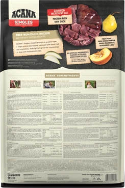 Begrænset ingredienser betyder ikke mindre kød. ACANA™ Singles Free-Run Duck tørfoder er baseret på en enkelt kødingrediens, ideelt til hunde med fødevareoverfølsomhed. Fremstillet med 50% ferske andeingredienser af høj kvalitet i WholePrey-forhold af kød og organer, plus E-vitamin, zink og kobber - vores eneste kosttilskud. Suppleret med hele, lækre Bartlett-pærer og græskar for fordøjelsessundhed og havalger som kilde til DHA og EPA. Indeholder ngen korn eller kartofler. Denne kost giver din hund det protein og de næringsstoffer, den har brug for, for at forblive glad, sund og stærk.