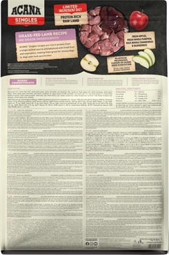 Begrænset ingredienser betyder ikke mindre kød. ACANA™ Singles Grass-Fed Lamb tørfoder er baseret på en enkelt kødingrediens, ideelt til hunde med fødevareoverfølsomhed. Fremstillet med 50% rå lammeingredienser og suppleret med hele grøntsager, Red Delicious-æbler og andre frugter og planter samt E-vitamin, zink og kobber - vores eneste kosttilskud. Ingen korn eller kartoffel er tilsat. Disse kibbles giver din hund den næring, den har brug for til at forblive glad, sund og stærk.