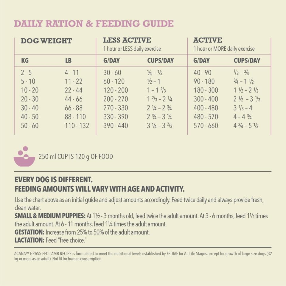 LAKTATION: Fodre "fri valg." ACANA™ GRASS-FED LAMB RECIPE er formuleret til at opfylde de ernæringsmæssige niveauer, der er fastsat af FEDIAF for alle livsstadier, undtagen for vækst af store hunde (32 kg eller mere som voksen). Ikke egnet til menneskelig konsum. *