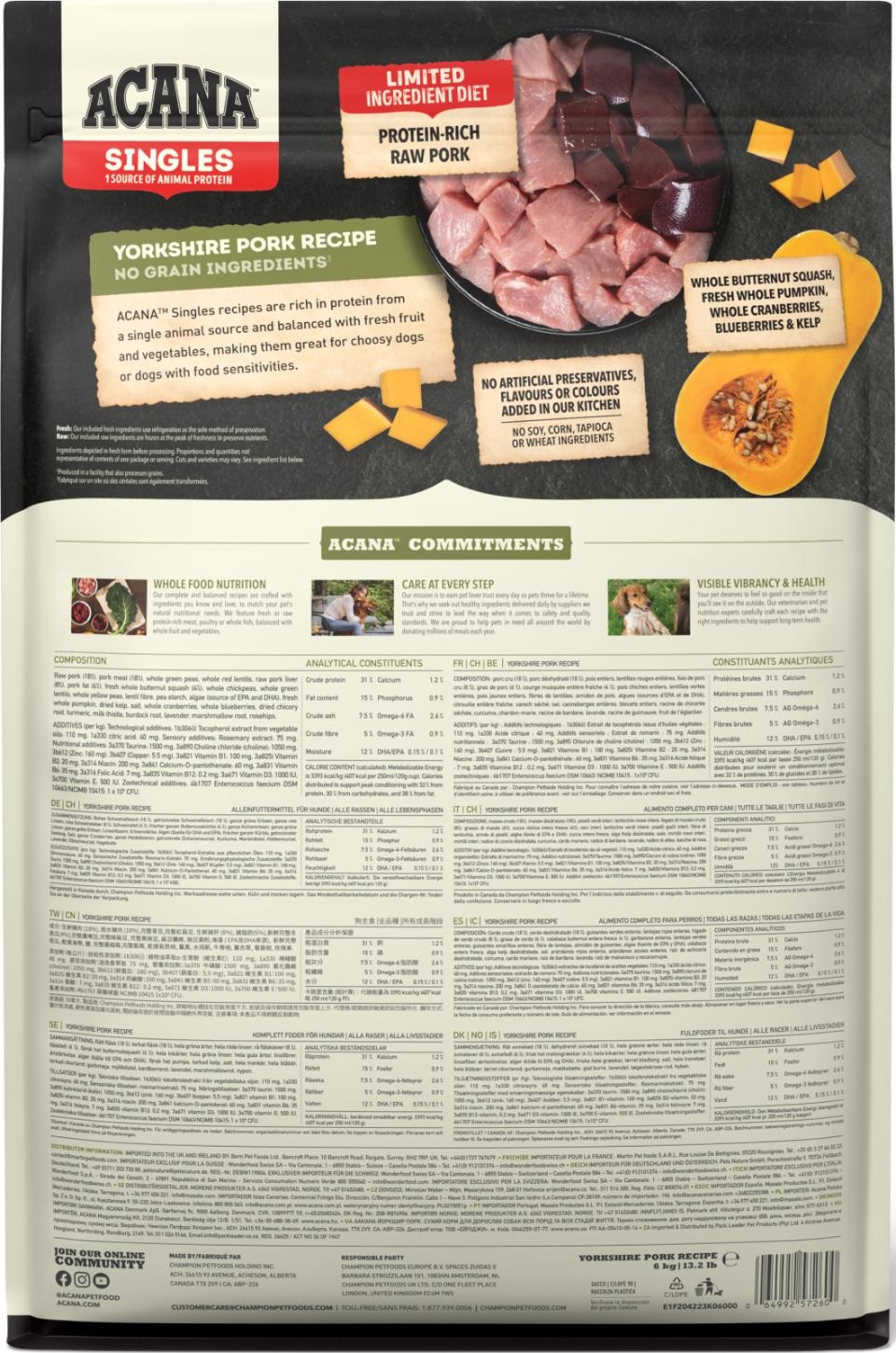 ACANA™ YORKSHIRE PORK er formuleret til at opfylde de ernæringsmæssige niveauer, der er fastsat af FEDIAF for alle livsstadier, undtagen for væksten af store hunde (32 kg eller mere som voksen). Ikke egnet til menneskelig konsum.