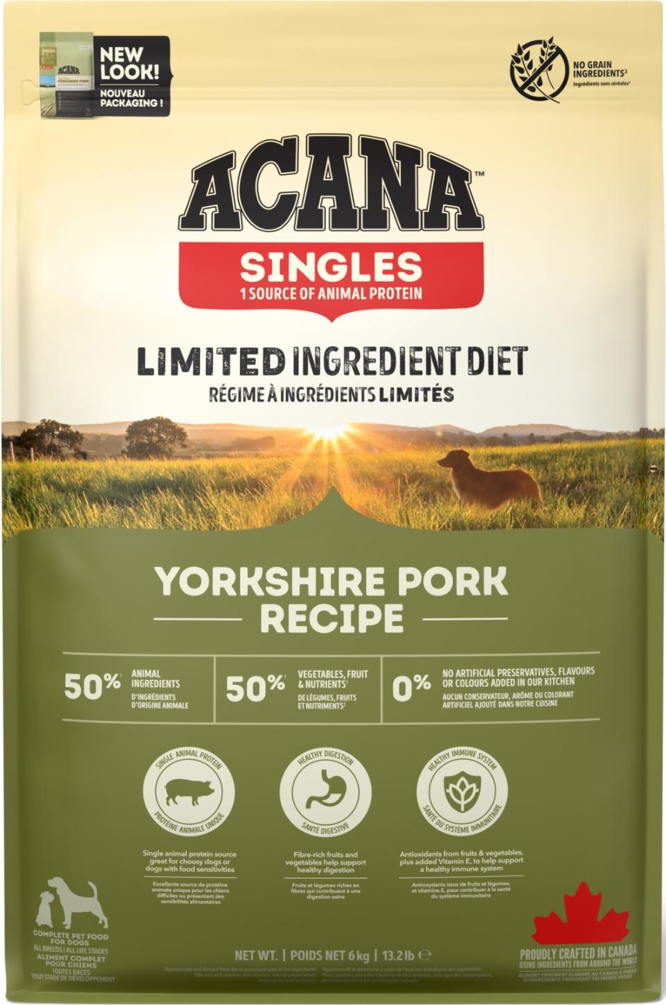 Begrænset ingredienser betyder ikke mindre kød. ACANA™ Singles Yorkshire Pork tørfoder er baseret på en enkelt kødingrediens, ideelt til hunde med fødevareoverfølsomhed. Fremstillet med 50 % fersk svinekød i WholePrey-forhold af kød og organer, plus E-vitamin, zink og kobber - vores eneste kosttilskud. Suppleret med hel, lækker squash for fordøjelsessundhed og havalger som kilde til DHA og EPA. Ingen korn eller kartoffel er tilsat. Denne kost giver din hund de proteiner, næringsstoffer og fibre, den har brug for, for at forblive glad, sund og stærk.