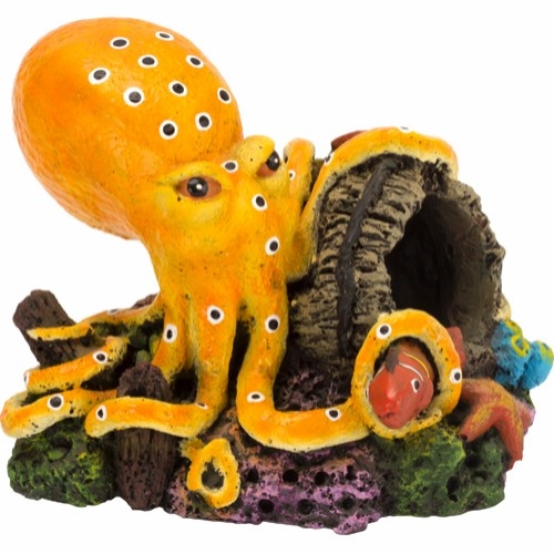 Akvarie dekoration - Blæksprutte med tønde - 11,5x8,7x8,7cm