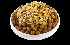 Lokkemad, smag eller godbid – du kender dit kæledyr bedst. Vores topper kan serveres alene eller tilsættes deres yndlings tørfoder for fugt og smag. Server op til 3 poser dagligt (juster portionsstørrelsen efter din hunds vægt, alder og træningsniveauer). Velegnet til hvalpe fra 3 måneder. Tjek, at dit kæledyr altid har rigeligt med frisk vand at drikke. Stil ubrugt portion på køl.