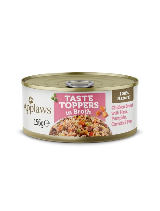 Applaws Taste Toppers vådfoder til hunde med kylling og skinke. 100 % naturligt hundefoder som består af første klasses ingredienser. Med magert og velsmagende kyllingebryst, der er en god kilde til fedtfattigt protein. Skinke er en desuden også en god kilde til protein. Med græskar, gulerødder og ærter, der alle fulde af essentielle vitaminer, mineraler og fibre. Helt fri for  kunstige farvestoffer, aromaer, smagsstoffer og konserveringsmidler.