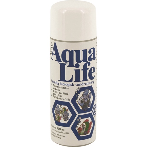 New Aqua Life Nedbryder fast affald og forurening. Fjerner ammoniak og nitrit. Nedbryder biologisk ufortæret foder. Holder vandet krystalklart. Forlænger intervallerne mellem rengøringerne. Modner hurtigt nyt akvarievand. Aktiverer hurtigt de biologiske filtre. Til fersk og saltvand. Indhold 150 ml. til 1500 L akvarievand