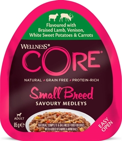 Lamme- muskelkød, mave, lever, hjerte, lunge (63%); Lamme bouillon (26,5%); kogt ris (4%); tomater (4%); chiafrø (1%); mineralstoffer (0,5%), tørret æggeskal (0,5%), tidselolie (0,5%).