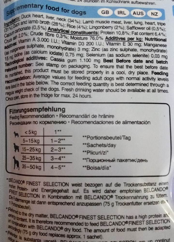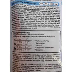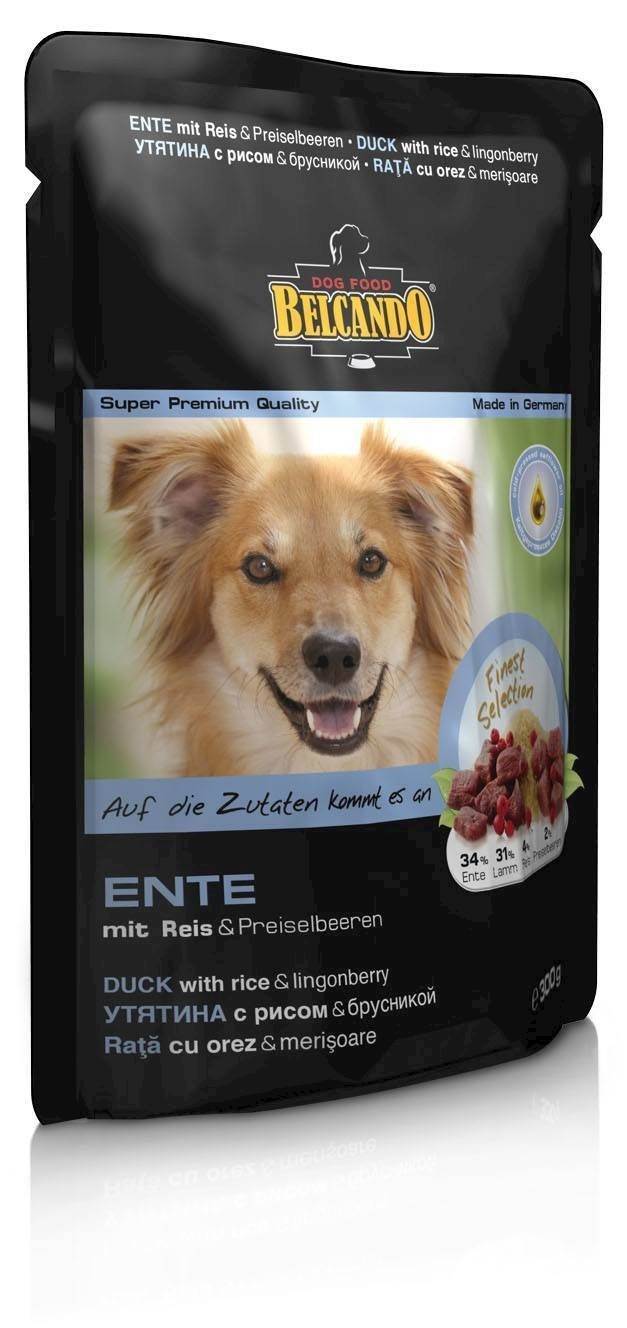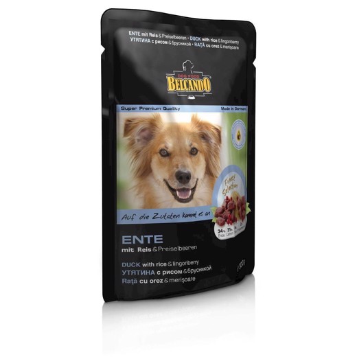 Belcando pose våd hundemad med 34% And, 31% Lam, 28% Ande og lammeboullion, 4% ris, 2% vilde tranebær