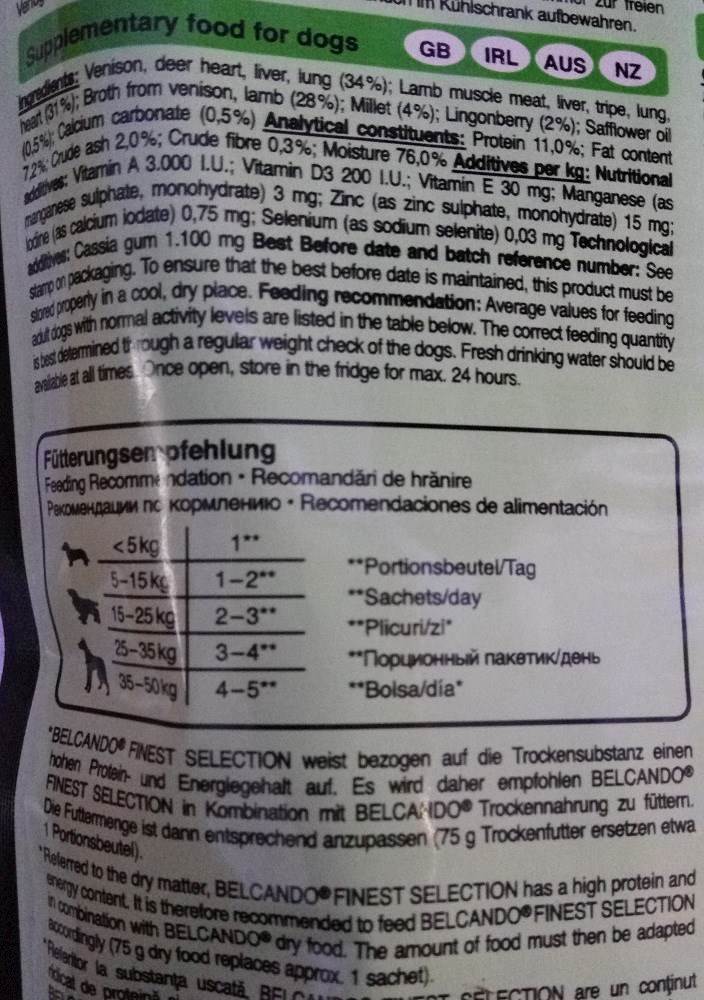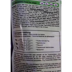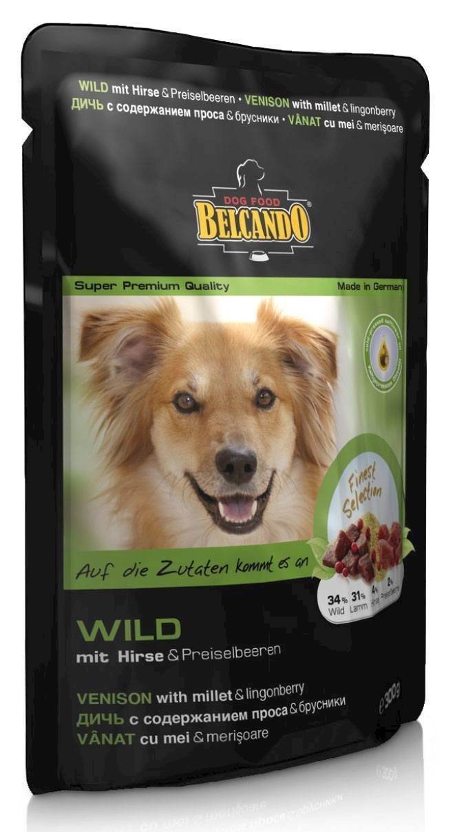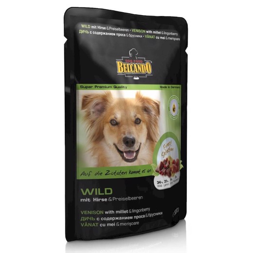 Belcando pose våd hundemad med 34% Hjort, 31% Lam, 28% hjorte og lammeboullion, 4% hirse, 2% vilde tranebær