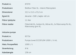 1stk. Bio Pad XL. 1 stk. Aktivkul svamp XL. 1 stk. Nitrax XL. 2 stk. Fin filtersvamp XL. 1 stk. Grov filtersvamp XL.