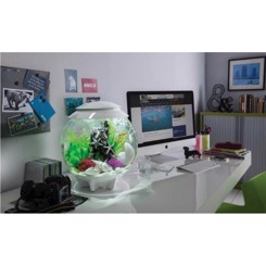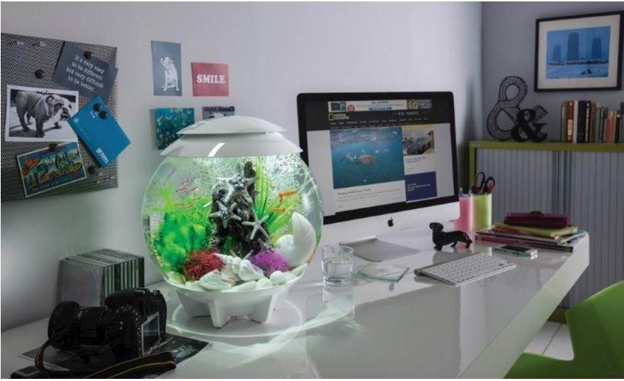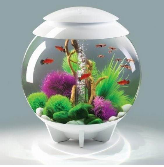 Visuelt sømløst akvarium i klassisk sfærisk design med skjult vandlinje og flerfarvet belysning