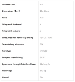 Komplet sæt bestående af akrylakvarium, lysenhed, pumpe, transformer, luftsten, filterpatron, keramisk bundlag