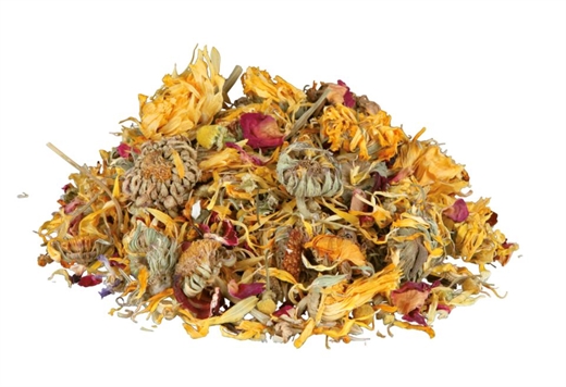 Morgenfrueblomster, hibiscusblomster, kamilleblomster, rosenblomster, hyben, pebermynte, salvie, perikon, malva-blomster.