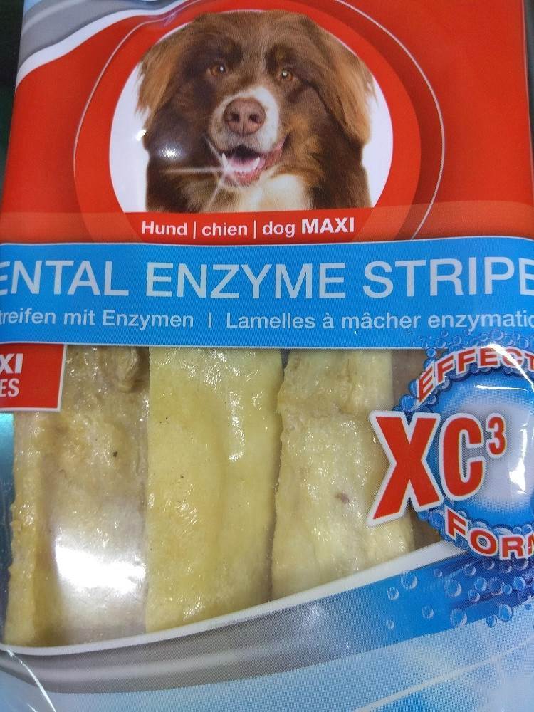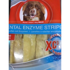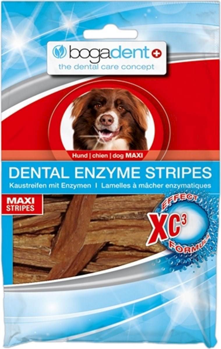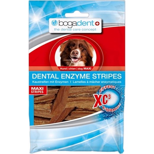 Bogadent® dental enzyme stripes maxi er den ideelle løsning til at kombinere tandpleje med tyggeglæde. Den innovative xc3-effect-formula er baseret på naturlige enzymer fremstillet af koncentreret valleprotein og to yderligere aktive ingredienser (frugtekstrakt cb90mx, mineraler). Det beskytter mod plaque og tartaropbygning og kan medvirke til at forhindre irritation af tyggegummi. Den usædvanligt lækre råhud I bogadent® dental enzyme stripes renser kun hundens tænder, mens de lykkeligt tygger.