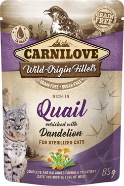 Portionsposer med stykker af kød og organer fra vildtlevende dyr, anrettet i sovs. Komplet foder eller lækkert som topping til tørfoder. Komplet foder til voksne katte.