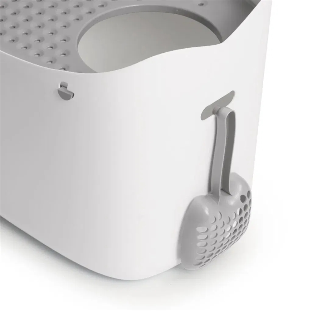 Kattetoilet med åbning i toppen. Flot design! Masser af fordele: Katten skraber ikke grus ud på gulvet, da åbningen er i toppen. Når katten forlader kattebakken, springer den typisk op på låget i toppen. Evt. grus på poterne ryger igennem de små huller og havner altså heller ikke på gulvet. Katten tisser ikke ved siden af.