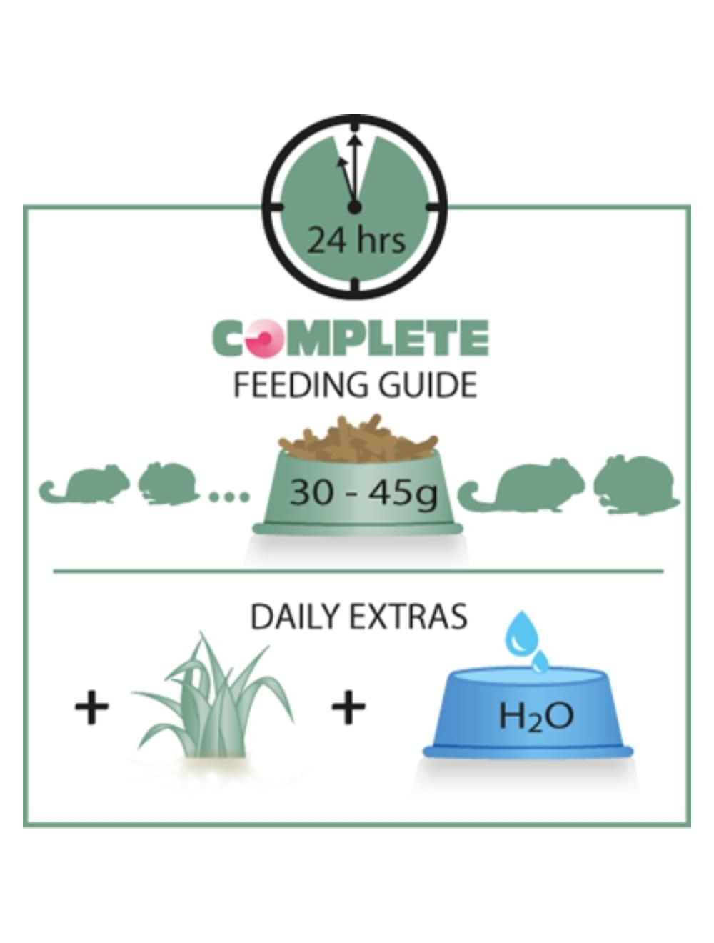 Afhængigt af chinchillaens eller deguens størrelse og alder anbefales en gennemsnitlig daglig foderration på 30 til 45 g.