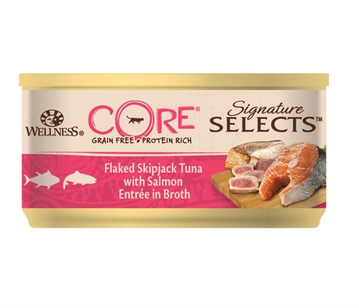Vores Wellness CORE Signature Selects Flaked Skipjack Tuna med Salmon Entree in Bouillon er komplette og afbalancerede måltider, som naturligt leverer det protein, smag og tekstur, som din kødædende higer efter.