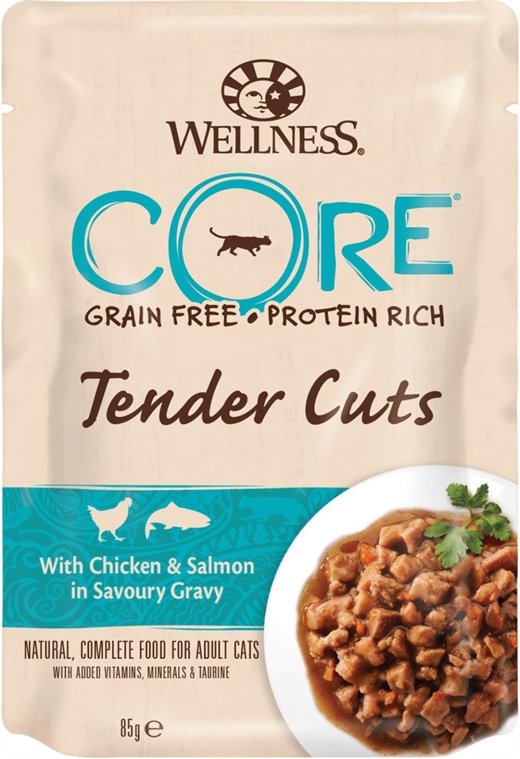 Vores Wellness CORE Tender Cuts med kylling og laks i velsmagende sovs er kornfri naturlige langsomt kogte møre udskæringer af fjerkræ kombineret med sunde grøntsager og frugter serveret i salte saucer, der giver en uimodståelig smag.