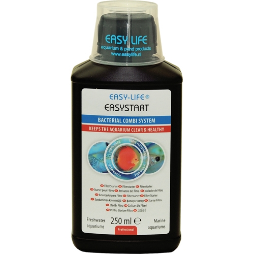 Easystart er en naturlig filtreringsstarter. Dets formål er hurtigt at rense og stabilisere vandet, når nyt ferskvands eller saltvandsakvarie tages i brug, så det er klar til fisk. EasyStart er en unik kombination af højaktive bakteriekulturer. Den unikke bakteriebærer sikrer accelereret øgning i antal af brugbare bakterier, sådan at for eksempel dannelsen af giftigt nitrit kan undgås. Det hjælper også til at reducere effekten fra harmfulde bakterier og fjerner tungmetaller og anden kemisk kontamination fra vandet. Resultatet er et sundt akvarie med livlige fisk med levende farver. ANVENDELSE af Easy-Life EasyStart: Ryst godt og tilsæt omgående. Grums og uklarheder i vandet vil forsvinde efter et par timer. Opbevares mørkt og køligt efter åbning.