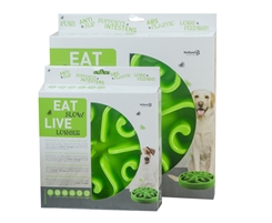Eat Slow Live Longer er en klassisk foderskål der udfordrer hundens intelligens og sanser og får den til at spise pænt og langsommere. Står på skridsikre gummifødder. Fødderne kan købes til som ekstraudstyr/reservedele. Findes i 5 farver, Small Ø20,5cm og Large 30cm.