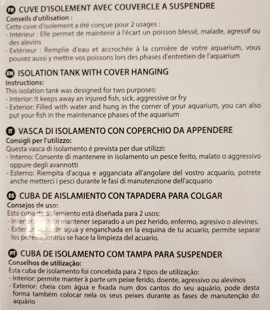 Plast kar til fangede akvariefisk, eller som isolations boks i kortere tid.