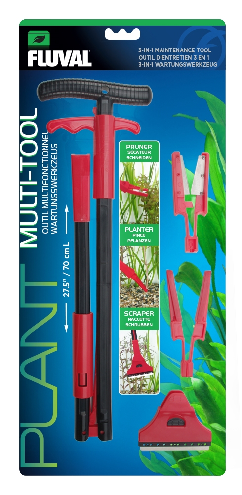 Sammenklappelig tang med 3 omskiftelige hoveder, én med flade kæber til opsamling, og én med klinger til at klippe, samt en barberbladsskraber.