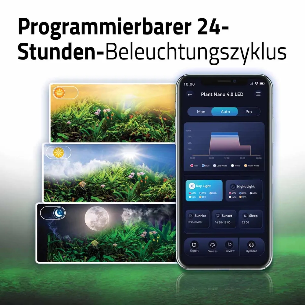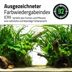 Den tyskdesignede Fluval Plant 4.0 Nano LED giver strålende, spektrumspecifik belysning for optimal plantevækst. Funktioner Kraftig fuldspektret belysning for maksimal plantevækst, farve og sundhed Tilpassede, uafhængigt styrede farvekanaler Fremragende CRI (Color Render Index), der gengiver levende fiske- og plantetoner for en autentisk og naturtro oplevelse Betjenes udelukkende via FluvalConnect-mobilappen Programmerbar 24-timers lyscyklus – juster indstillingerne for solopgang, middag, skumring og nat for at efterligne naturlige sol- og månecyklusser Forudindstillede miljøer – vælg mellem flere praktiske akvarieprofiler IP67 avanceret beskyttelse mod vand, fugt og støv med glaslinse af høj kvalitet Aluminiumslegeringsramme, der fordeler varmen jævnt for at forbedre belysningseffektiviteten og levetiden Justerbar positionering – op/ned, for/bag, fra side til side Designet i Tyskland Hvad medfølger LED-lys med 2 m ledning Strømforsyning