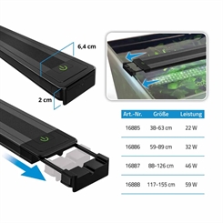Den tyskdesignede Fluval Plant 4.0 LED giver strålende, spektrumspecifik belysning for optimal plantevækst, farve og sundhed. En overlegen CRI på 90 sikrer levende farver, der bringer dit akvarium til live. Med FluvalConnect-appen kan du nemt tilpasse alle lysindstillinger fra din mobilenhed, inklusive uafhængige farvekanaler, en 24-timers lyscyklus, dynamiske effekter, forudindstillede miljøer og flere akvariestyringsfunktioner. Lysenheden tilbyder avanceret IP67-beskyttelse mod vand, fugt og støv, sammen med en glaslinse af høj kvalitet for enestående lysydelse og holdbarhed. Standardmonteringsmuligheder inkluderer udtrækkelige beslag samt nye højdejusterbare beslag. Funktioner Kraftfuld fuldspektret belysning for maksimal plantevækst, farve og sundhed Tilpassede, uafhængigt styrede farvekanaler Fremragende CRI (Color Render Index) gengiver levende fiske- og plantetoner for autentisk, naturtro visning Drevet udelukkende via FluvalConnect-mobilappen Programmerbar 24-timers lyscyklus – juster solopgang, middag, skumring og nat for at efterligne naturlige sol- og månecyklusser Forudindstillede miljøer – vælg mellem flere praktiske akvarieprofiler IP67 avanceret beskyttelse mod vand, fugt og støv med glaslinser af høj kvalitet Aluminiumslegeringsramme fordeler varmen jævnt for at forbedre lyseffektiviteten og levetiden Udtrækkelige beslag passer til en række akvariebredder til akvariemontering Forhøjningsbeslag muliggør justerbar lodret positionering (inkluderet) Valgfrit ophængningssæt sælges separat (varenummer A20482) Designet i Tyskland Hvad er inkluderet LED-lys med 2 m ledning Udtrækkelige forhøjningsbeslag Strømforsyning