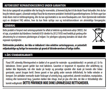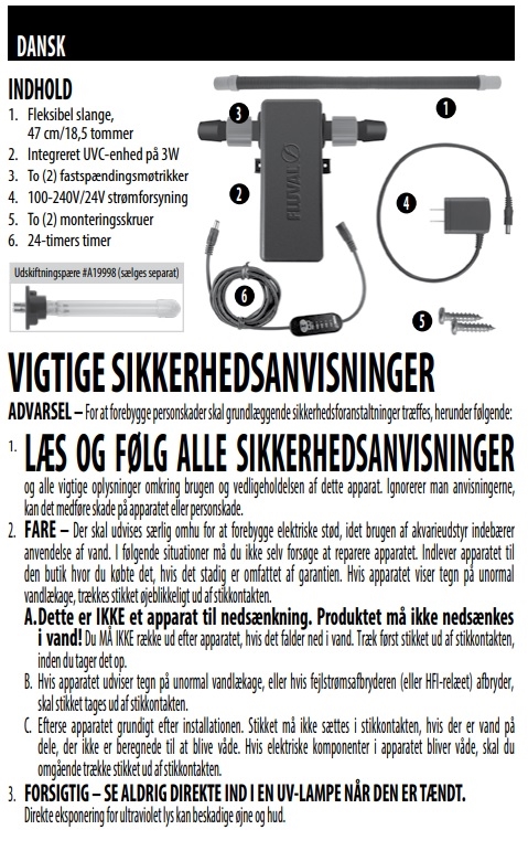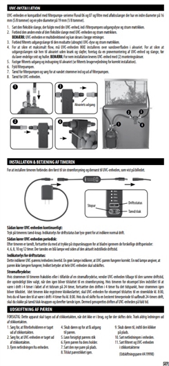 • UVC-pæren har en levetid på op til 30.000 timer. Det er vigtigt at holde øje med pæren og udskifte hele enheden, når den nærmer sig slutningen af sin levetid for at sikre effektiviteten. Pæren kan udskiftes.