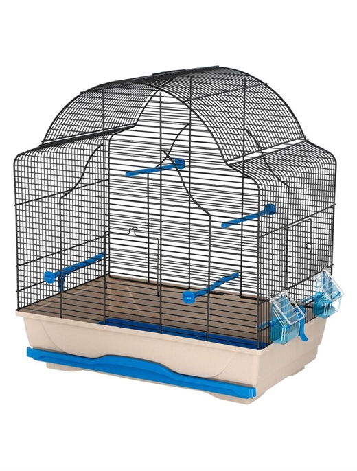 Daisy fuglebur fra firmaet MPS. Tremmer i metal med låge i fronten og i siden og plastbund med udtræksskuffe for nem rengøring. Med 4 siddepinde og 2 foder-/vandskåle.