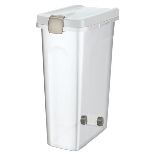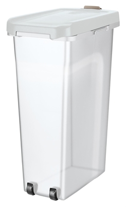 Denne fodertønde i transparent og hvid farve er en lufttæt beholder designet til opbevaring af tørfoder og lignende produkter. Den sikrer, at foderet forbliver friskt og beskytter det mod