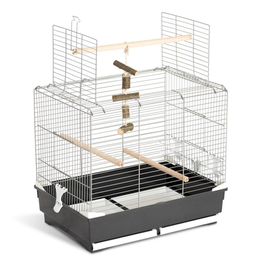 Ivonne fuglebur fra firmaet MPS2. Kraftige tremmer i metal med låge i fronten og i siden. Plastbund med 2 skuffer for nem rengøring. 2 låger gør taget kan åbnes, og der kan monteres en siddepind, så fuglen kan flyve frit. Med 2 siddepinde, og 2 foder-/vandskåle.