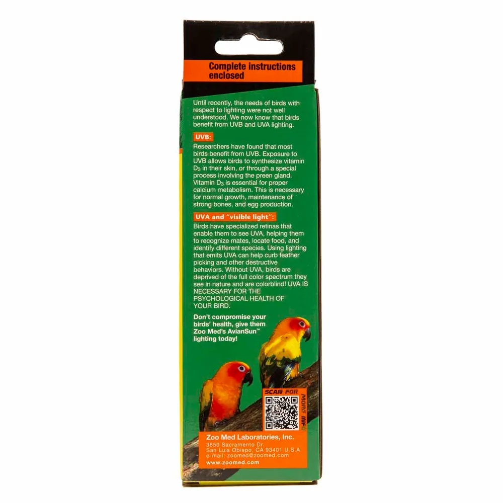 Avian Sun 5.0 UVB Compact Fluorescent giver fugle sikre niveauer af gavnlig UVB og UVA for fysisk og mental sundhed. UVB gør det muligt for fugle at producere D3-vitamin til korrekt calciummetabolisme, hvilket er essentielt for normal vækst, vedligeholdelse af stærke knogler og ægproduktion. UVA er synligt for fugle og gør det muligt for dem at genkende partnere, finde føde og identificere forskellige arter. Uden UVA er fugle i bund og grund farveblinde!