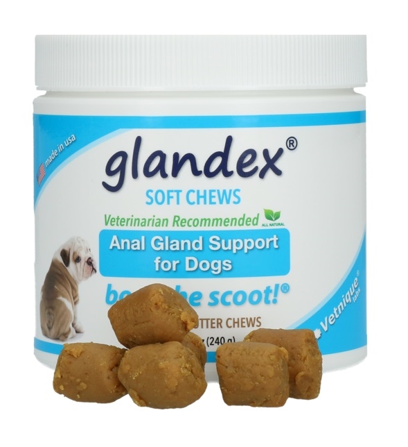 Glandex Soft Chews De bløde snacks med peanutbuttersmag fremmer fordøjelsen og understøtter en naturlig tømning af analkirtlerne. Glandex Soft Chews De bløde snacks med peanutbuttersmag fremmer fordøjelsen og understøtter en naturlig tømning af analkirtlerne. Analkirtelproblemer er et almindeligt problem hos hunde. Glandex Soft Chews blev udviklet og fremstillet specielt til dette formål. Ved hver afføring kommer der en smule indhold ud af analkirtlerne og på den måde bliver problemerne mindre eller forsvinder helt.