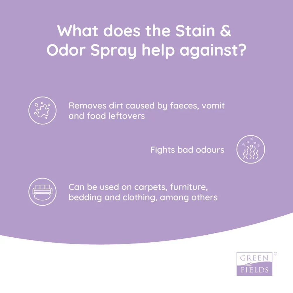 Stain & Odor Spray fra Greenfields indeholder biokultur og hjælper med at fjerne alle genstridige pletter og lugt fra urin, afføring, opkast og madrester fra dit kæledyr. Stain & Odor Spray bekæmper lugt på en organisk måde, og kan bruges på alle gulvbelægninger og møbler, fremstillet af: tæppe, træ, fibrer, beton, fliser og plastik.