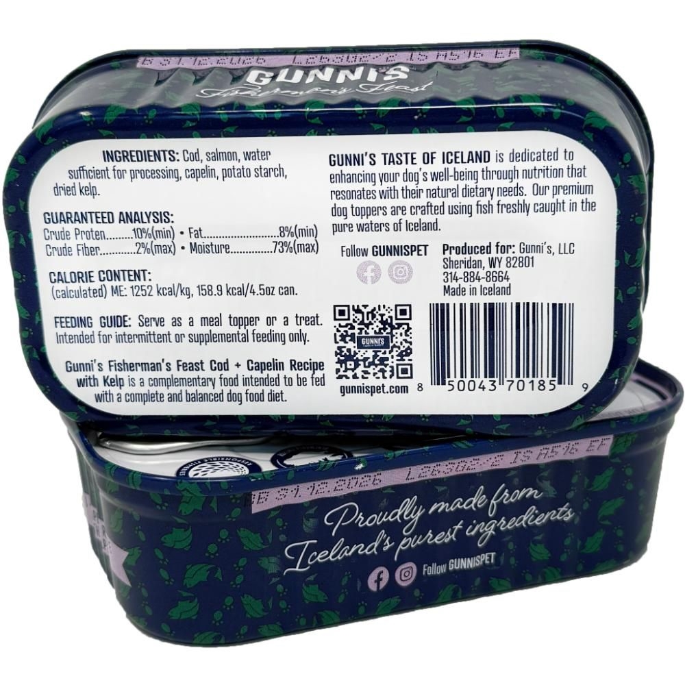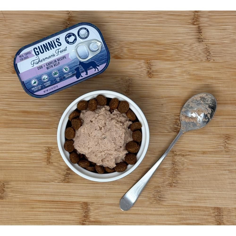 Gunnis Fisherman's Feast Torsk og Lodde med Tang. Et lækkert supplementfoder beregnet til at blive fodret sammen med et komplet og afbalanceret hundefoder for at gøre det ekstra spændende for hunden.  Denne premium topping er fremstillet af fisk fanget i det rene islandske vand.