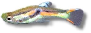 Poecilia sp. edler,  Vildt guppy er en lille guppy hvor hannen kun bliver 2cm mens hunnen bliver over dobbelt størrelse.