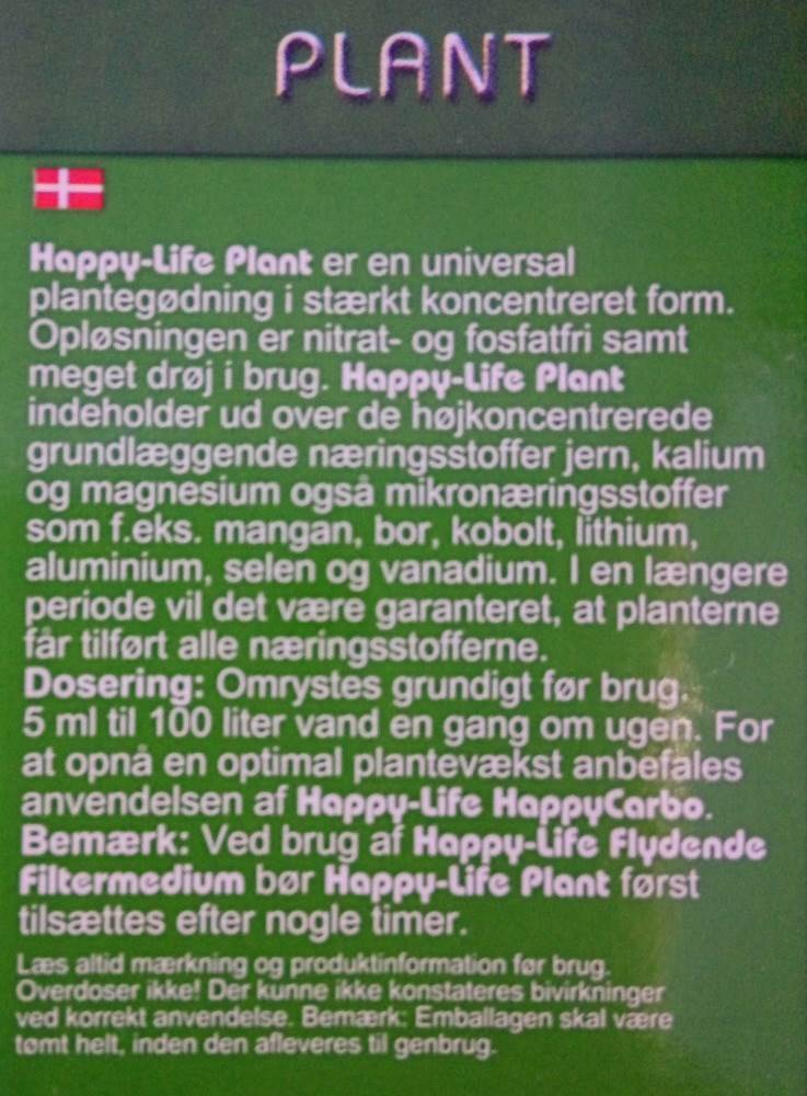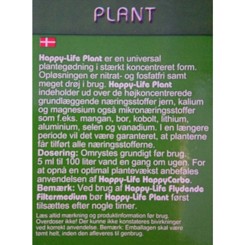 Happy-Life HappyPlant indeholder, ud over de koncentrede grundgødninger jern, kalium og magnesium, også sporelementer som fx mangan, bor, kobolt, litium, aliminium, selen og vanadium.