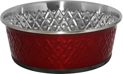 Hundeskål på 1900 ml lavet i rustfrit stål i flot mønsterrød, denne skål kan bruges til både vand eller mad.