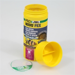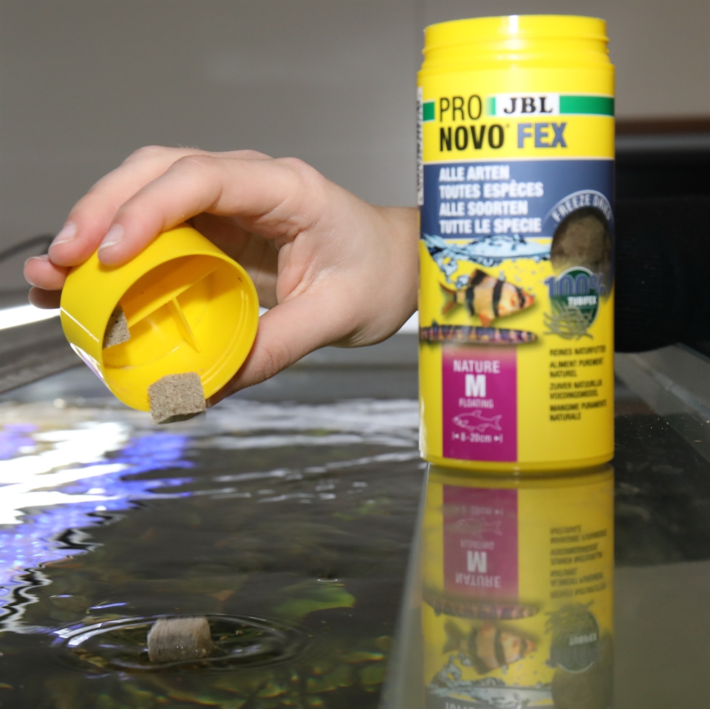 Det lyder måske indlysende, men det er vigtigt, at foderstørrelsen passer til fiskens mundstørrelse. Ikke alle fisk er i stand til at bide større stykker mad af. Den fiskestørrelse, som foderstørrelsen passer til, er angivet på alle JBL-maddåser nederst til venstre på forsiden af ​​etiketten.