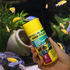 : JBL-fiskefoder . Optimalt protein-fedt-forhold. Hovedsageligt proteiner fra vanddyr. Reduktion af algevækst og optimal fiskevækst gennem justeret fosfatindhold. Præbiotika: Præbiotika er "substrater, der bruges selektivt af værtsmikroorganismer og giver sundhedsmæssige fordele." Forskere er enige om, at de fremmer fordøjelsen og dermed sundheden. Med vores fisk er der et andet vigtigt aspekt: ​​Bedre fordøjelse betyder mindre udskilles og vandet forurenes mindre, hvilket betyder færre algeproblemer og vandet forbliver renere. Da størstedelen af ​​de vedligeholdte cichlider fra Tanganyika-søen er rovdyr, blev føden til rovdyrene kaldt PRONOVO TANGANYIKA. Da de fleste af de vedligeholdte arter fra Malawi-søen er unge fodrer, har JBL givet denne fødevare navnet PRONOVO MALAWI.