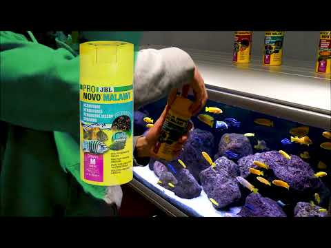 : JBL-fiskefoder . Optimalt protein-fedt-forhold. Hovedsageligt proteiner fra vanddyr. Reduktion af algevækst og optimal fiskevækst gennem justeret fosfatindhold. Præbiotika: Præbiotika er "substrater, der bruges selektivt af værtsmikroorganismer og giver sundhedsmæssige fordele." Forskere er enige om, at de fremmer fordøjelsen og dermed sundheden. Med vores fisk er der et andet vigtigt aspekt: ​​Bedre fordøjelse betyder mindre udskilles og vandet forurenes mindre, hvilket betyder færre algeproblemer og vandet forbliver renere. Da størstedelen af ​​de vedligeholdte cichlider fra Tanganyika-søen er rovdyr, blev føden til rovdyrene kaldt PRONOVO TANGANYIKA. Da de fleste af de vedligeholdte arter fra Malawi-søen er unge fodrer, har JBL givet denne fødevare navnet PRONOVO MALAWI.