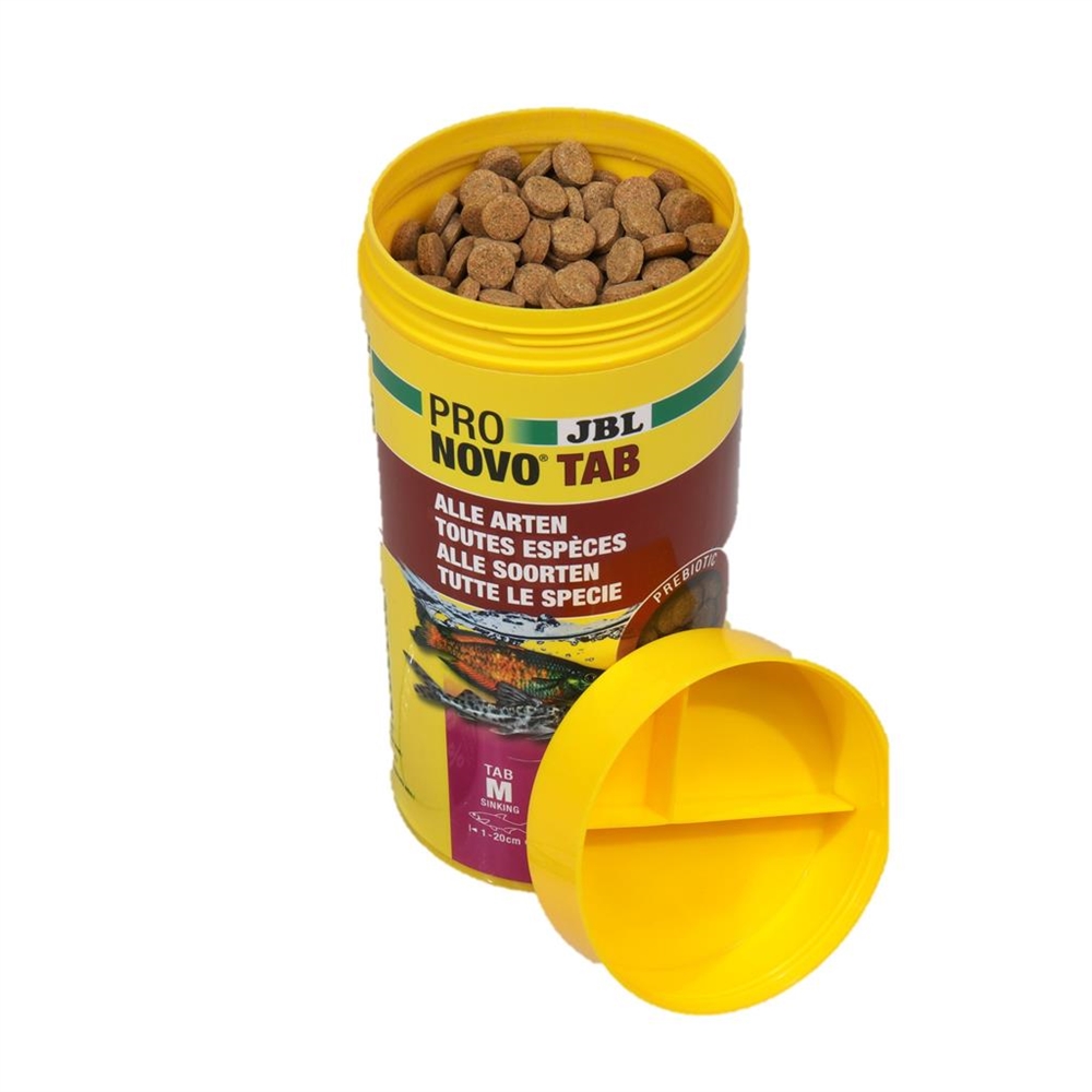 Næsten alle bundlevende fiskearter spiser JBL PRONOVO TAB. Men de fritsvømmende fiskearter lærer hurtigt af lugten, at tabletten består af mad. Meget store fisk spiser dem hele, mindre bider af. Når tabletten er fastgjort til ruden, spiser alle fiskene den med glæde og er meget sjove at se.