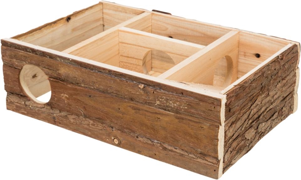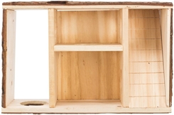Dette lege- og sovehus til hamster er en multifunktionel oase med fire rum og en integreret rampe. To af rummene er mørklagte soverum, hver med en komfortabel bund. Det aftagelige tag gør rengøring nem og muliggør observation af dine kæledyr. Huset er lavet af nåletræ med bark, uden harpikskanaler, da harpiks kan være giftig. Træet undergår en omhyggelig tørreproces for at sikre, at det ikke frigiver harpiks. Limen, der anvendes, er ugiftig og består af en sikker kautsjuk- og celluloseblanding. Skab et trygt og stimulerende miljø for din hamster med dette omhyggeligt designede lege- og sovehus.